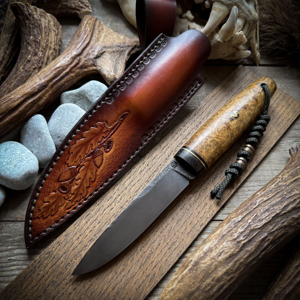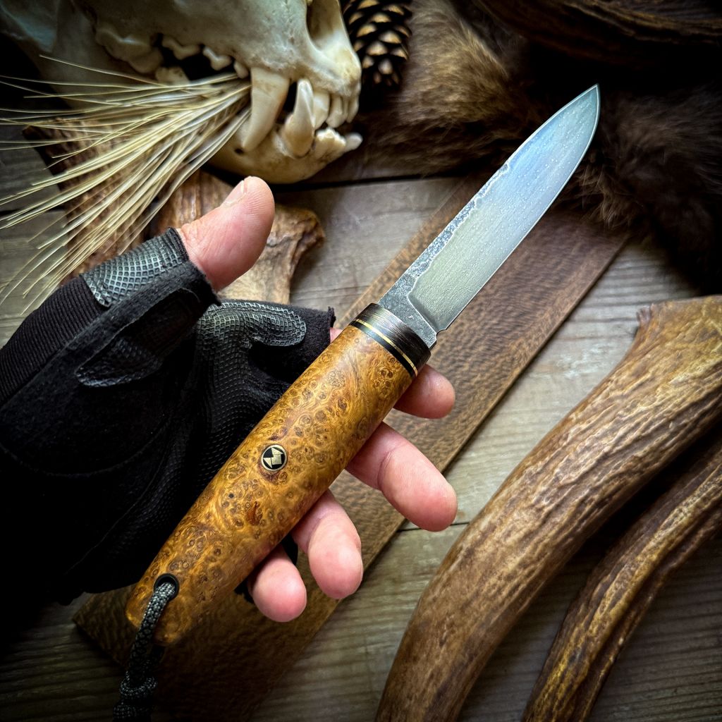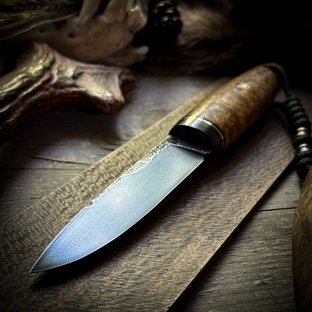 • Клинок изготовлен из авторской кованой булатизированной стали ШХ15СГ с твёрдостью 64 HRC. Отличается высокой режущей способностью, долгим удержанием заточки и характерным насыщенным оттенком булата, гляньте на текстуру.