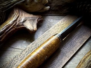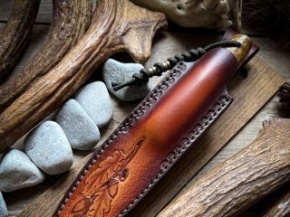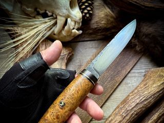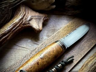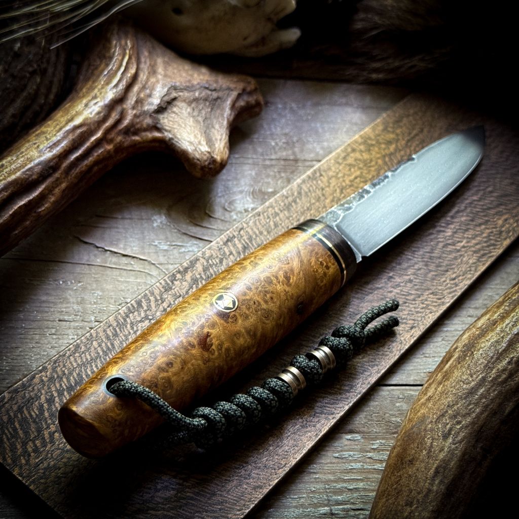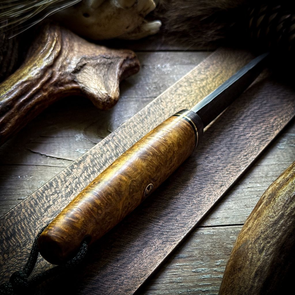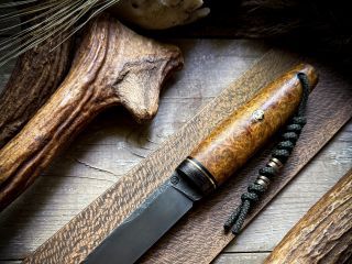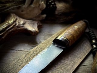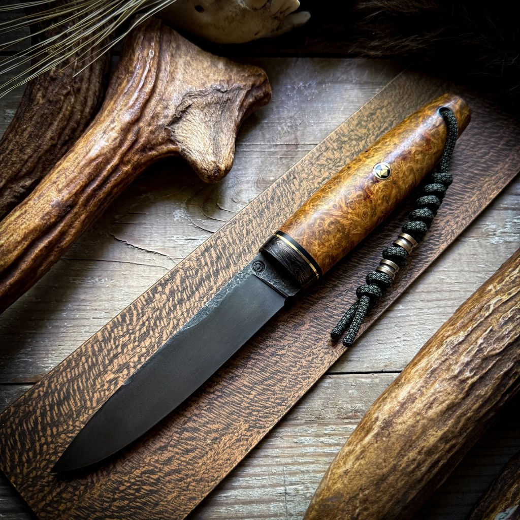 • Клинок изготовлен из авторской кованой булатизированной стали ШХ15СГ с твёрдостью 64 HRC. Отличается высокой режущей способностью, долгим удержанием заточки и характерным насыщенным оттенком булата, гляньте на текстуру.
